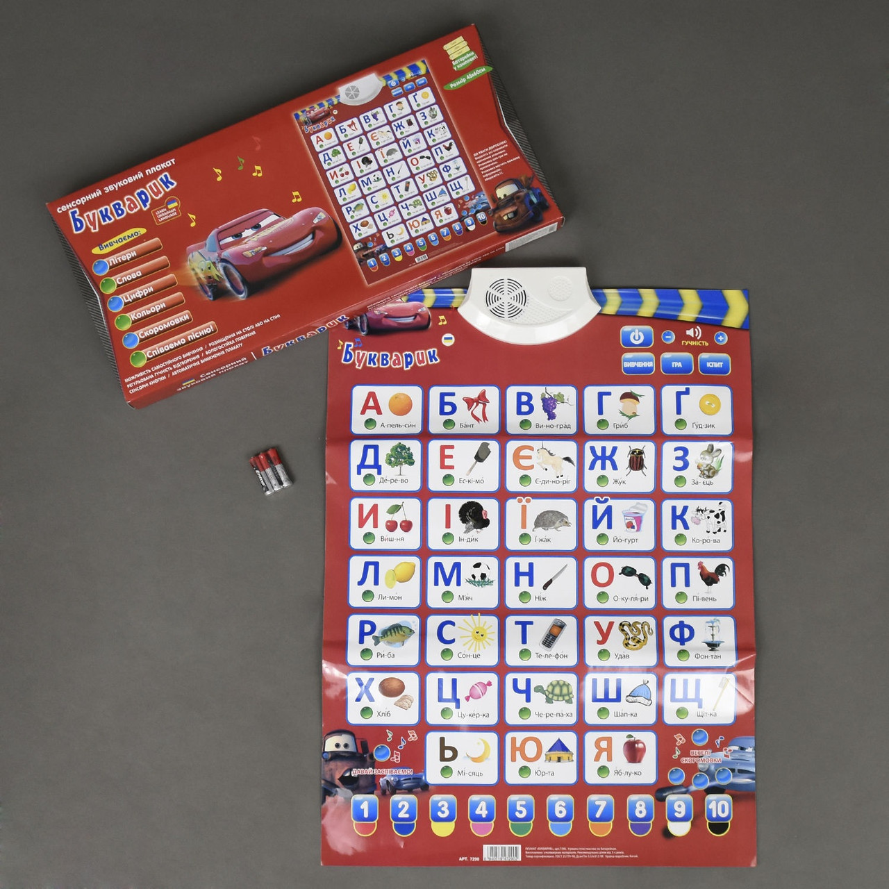 Інтерактивний плакат «Букварик» має великі кнопки та зручне керування, яке допомагає дитині навіть самостійно вивчати літери українського алфавіту. Сам плакат прикрашений зображеннями героїв, що полюбився багатьом мультиплікаційного фільму «Тачки». Іграшка дає змогучувати скоромовки, співати разом із Метром веселі пісні, вивчати букви, слова та цифри разом із Блискавкою МакКуїном. Крім того, малюк зможе дізнатися, чим відрізняються один від одного кольори. Спеціальне кріплення на задній стороні абетки дає змогу розмістити гру на столі або підвісити на стінку в дитячій кімнаті. Виконаний із полімерних матеріалів. Є регулювання звуку, сенсорні кнопки й автоматичне вимкнення. Вологостійка поверхня. Працює від трьох батарейок типу ААА, які входять до комплекту. Інтерфейс іграшки українською мовою. Є звукові ефекти. Розмір плаката:44Х2Х62.